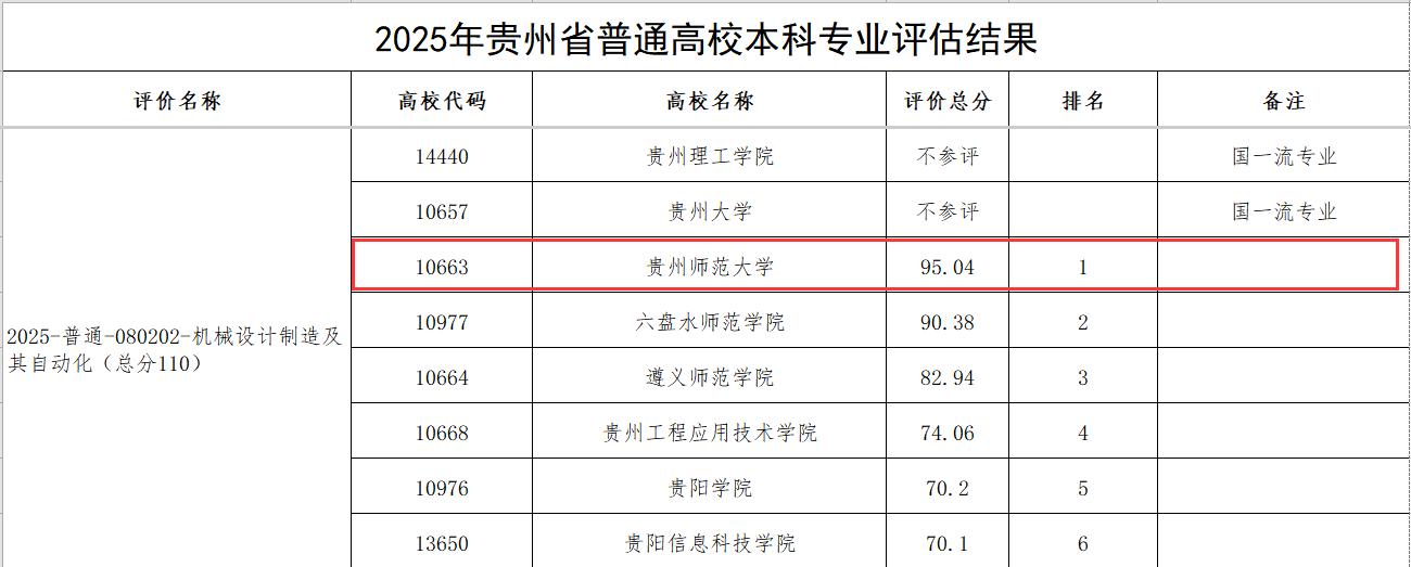 捷报传来,振奋人心!近日,贵州省教育厅正式公布《省教育厅关于公布2025年普通高校本科专业评估结果的通知》,我院机械设计制造及其自动化专业凭借扎实的学科基础、优异的人才培养质量与突出的社会服务能力,在全省同类专业中脱颖而出,以总分第一的优异成绩顺利通过评估,为学院学科建设再添浓墨重彩的一笔,该专业也是全省“金专”建设专业。